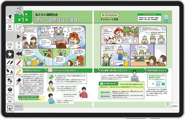 使いやすいツールバーに、多彩な書き込み機能、教科書QRコンテンツへワンタッチでアクセスなど、豊富な基本機能を備えています。また、音声読み上げやリフロー機能、背景・文字色の変更など、学習支援機能も充実しています。