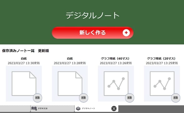「デジタルノート」はすべてのデジタル教科書に共通で搭載されています。紙面同様、ペンでの書き込みやふせんの貼り付け、編集画面の画像保存などが行えます。調べたことを一旦整理したり、途中の計算式を書き残したり、さまざまな場面で活用いただけます。