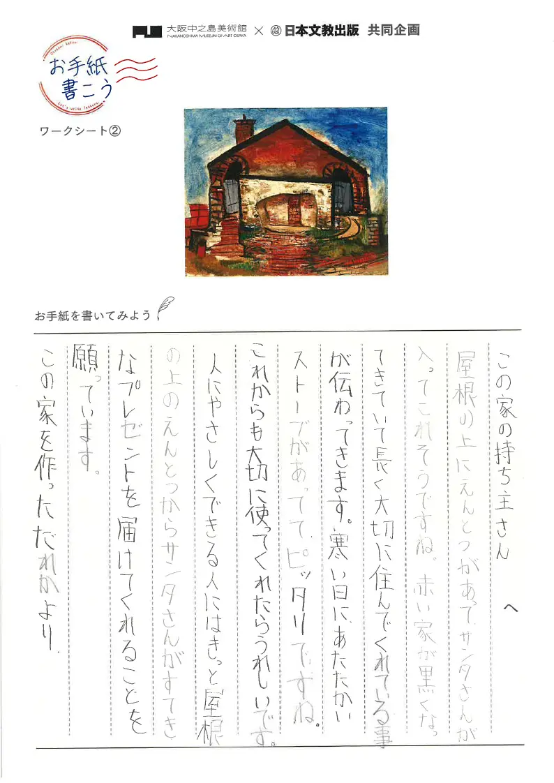 この家には「えんとつ」があります。家は「たくさんのレンガ」を使っていて、「かいだん」もあります。全体よりも部分をみつめたから分かることです。この家がつくられてから「何年」もたって「古くなった」と思ったのは、筆のあとや色の変化からでしょう。「もうすぐ太陽があがってきそう」なのは、家の背景の色から考えたことでしょう。この子は絵から『年月』や『時間』も感じているのです。そして、たどりついたのは、この家には「若い人」が住んでいることです。たくさん絵とおしゃべりして書かれた手紙です。