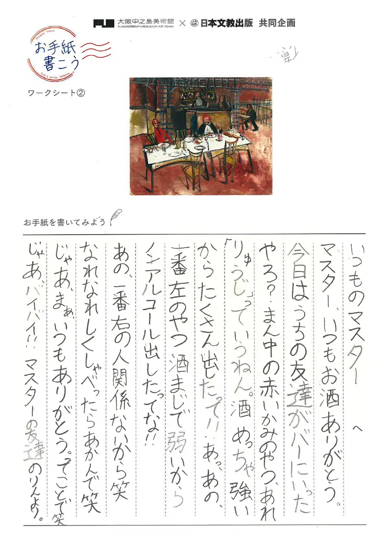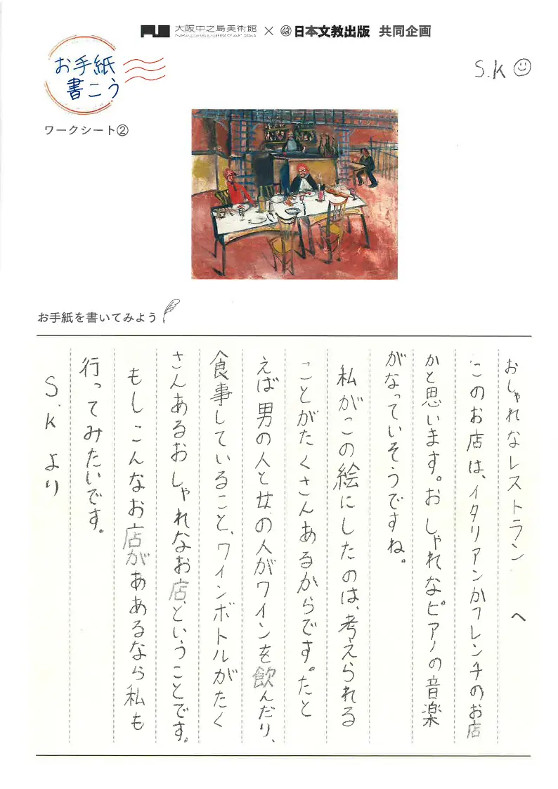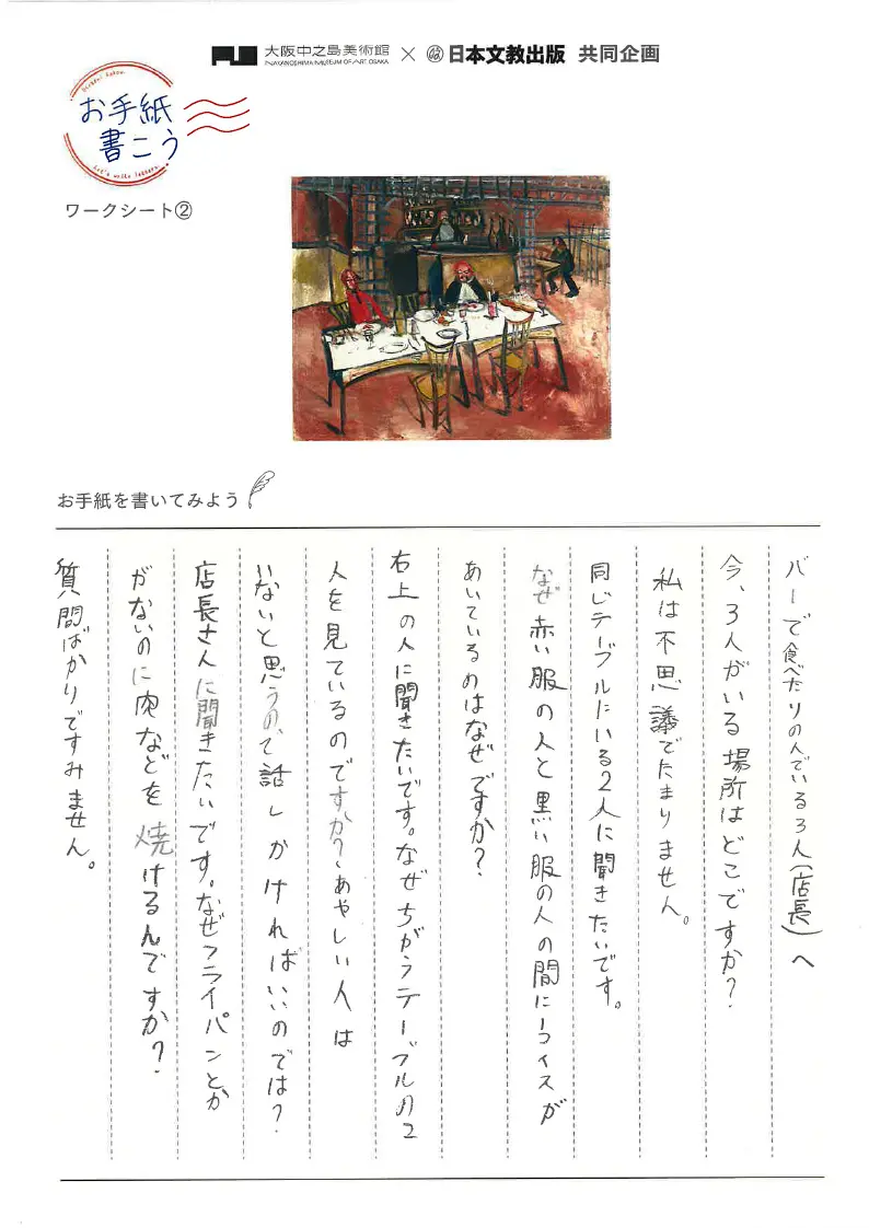 手紙を書いた子は「考えることがたくさんあるから」この絵を選びました。「イタリアンかフレンチのお店」は自分の経験を反映して考えたことでしょう。「おしゃれなピアノの音楽」がなっているのは、この子が絵から『音』を聴いていることを示しています。「ワインボトルがたくさんある」は、店主の背後にある棚から見つけたことです。人々がワインや食事を楽しむ「おしゃれな店」に「行ってみたい」と言っていますが、すでに、この子は、この絵の中に入り込んで、十分に楽しんでいます。