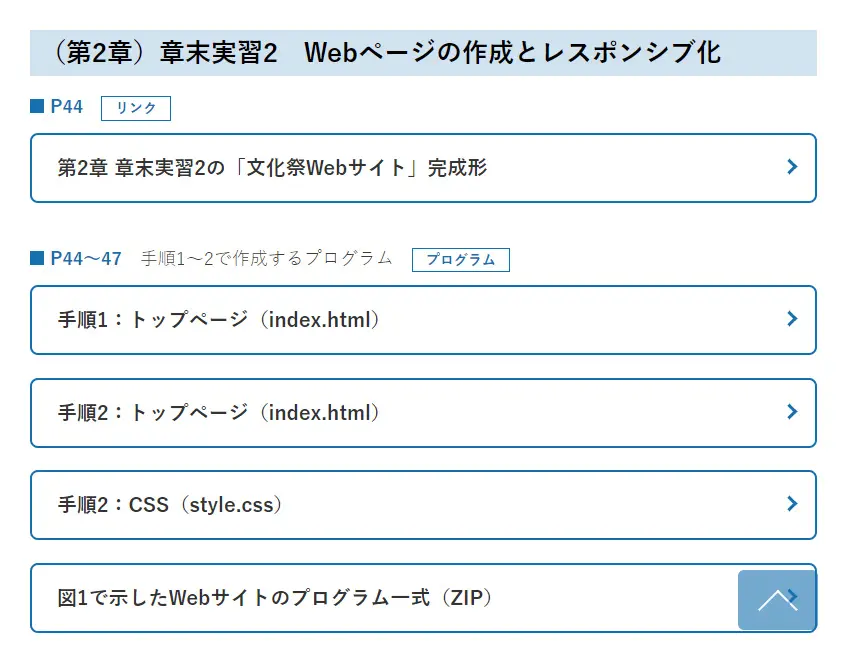 実習の中で記載したプログラムデータ(プログラムのソースコード)を提供しています。コードの一部を書き換えたり、表示や動作を検証したり、お使いのエディタやワープロソフトでご自由にご活用ください。