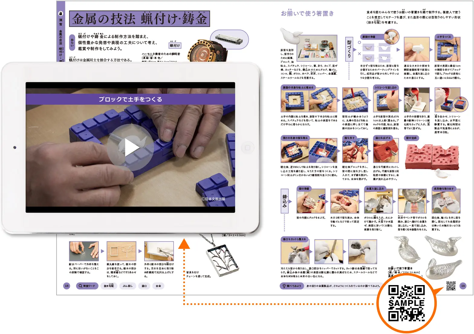 工芸Ⅱの教科書からは2つのインタビュー動画と、2種類の技法動画をQRコンテンツとして視聴することができます。インタビュー動画では工芸品のプロデューサーおよび人間国宝の話を視聴することができます。工芸に携わる様々な視点からお話を伺っています。また、技法動画ではステンドグラスと鋳金について、教科書掲載のプロセス写真にひも付いた動画クリップを多数収録。厳選したデジタルコンテンツで、ICT活用の指導をサポートします。