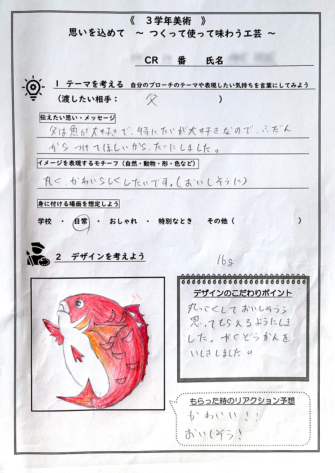 福島県中学校教育研究会美術部会の研究主題である「造形活動における自己実現を通して、豊かな心を育む美術教育はどうすればよいか」をふまえ、自分の想いを形にすることで、表現する喜びを感じるとともに、相手のことを考えて工夫する中で、思いやりや感謝の気持ちを育める授業にしたいと考えた。そこで、装飾品として活用でき、また飾って楽しむこともできるブローチ制作に取り組むことにした。義務教育最後の3年生がこれまで身に付けた知識や技能を活用しながら、贈る相手へ想いを馳せ、その人への想いを形や色彩で表現するのに効果的であると考えた。