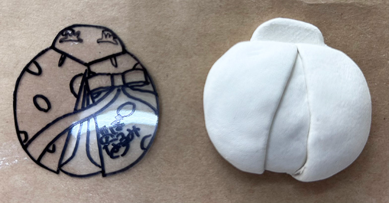 ○アイデアスケッチをプラ板シートに転写し、形に沿ってはさみで切る。それを伸ばし棒を使って平らにした粘土の上に配置し、カッターや竹串を使って型抜きをする。 |