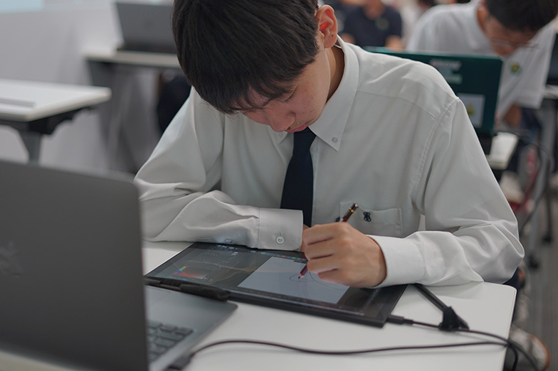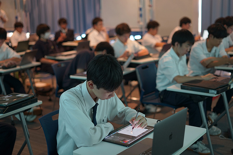 本校にはレギュラー・アドバンスクラスに加え、「ものづくり・ことづくり」を通じてグローバルな人材を育成するコース「GIC(グローバルイノベーションクラス)」が併設されている。このGICが掲げるのは、探求型教育を推し進めた「共創型の学び」で、知識の一方向的伝達ではなく、対話とフィードバックを通じて新たな価値を創造することを重視する。本単元では、情報科と美術科の教員が学習過程を共同で設計し、チームティーチングを行っている。それぞれの専門性を融合させることで、情報デザインで扱う題材の可能性を広げるのと同時に、生徒とともに創造性な学びを実現している。