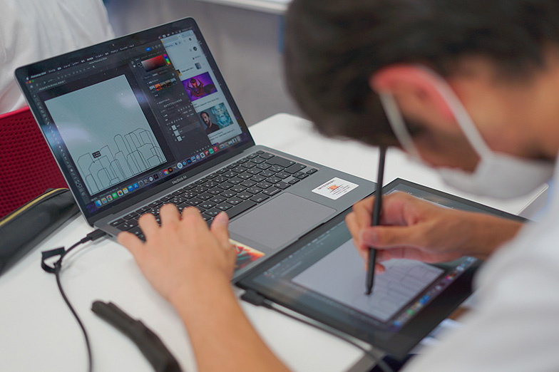 デザインソフトを用いて作品の土台となるデータを作成している様子。