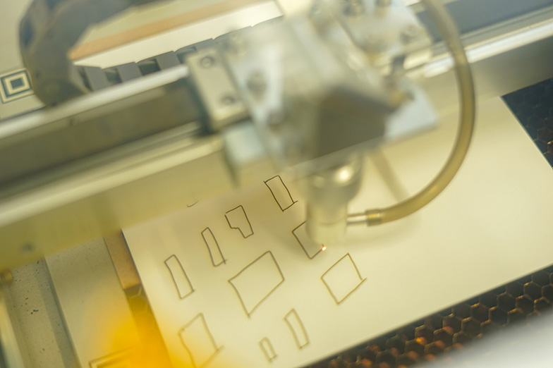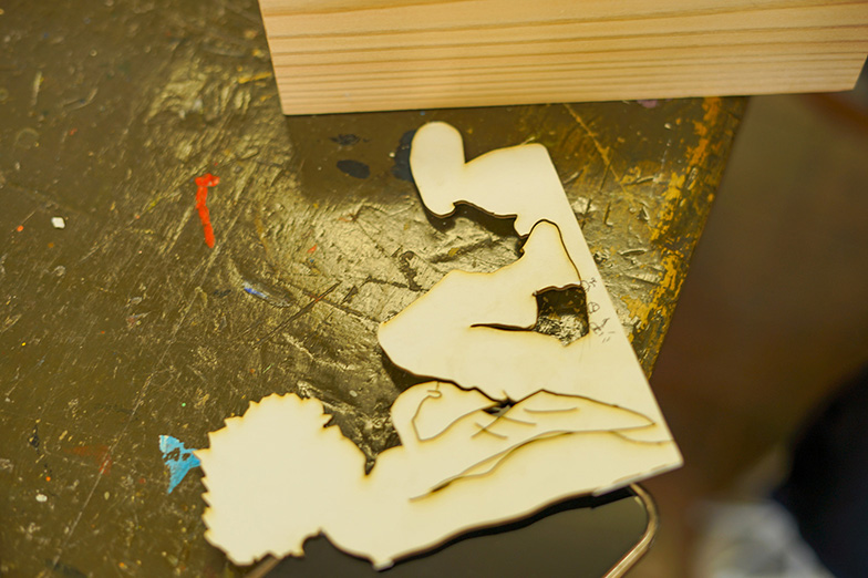 作成したデータをもとに、レーザーカッターで材料を加工。切り出した部材に着色する工程。