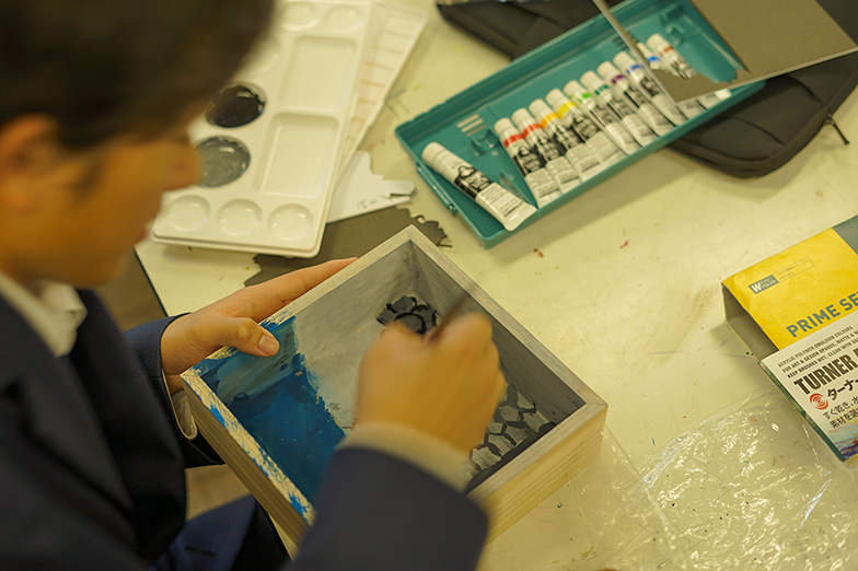 ●マットボードに着彩し、箱の内部に配置して立体作品として組み上げる。 |