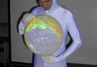 NOAAのサイト(National Geophysical Data Center (NGDC) http://www.ngdc.noaa.gov/ngdc.html)には,衛星写真を元にした美しくリアルな地球が自転している動画がある。これを,ただスクリーンのような広い平面に投影するのではなく,段ボール紙を直径50cm程の円に切り取り,それを手に持つ形で投影を行った。あたかも自分自身の手の中に回転する地球を抱いているような気分になる。また,白いビーチボールを用いて球体上に投影してみたが,投影距離の差ができ,周囲のピントが合わなくなるので,円盤の方が良いことが確かめられた。
