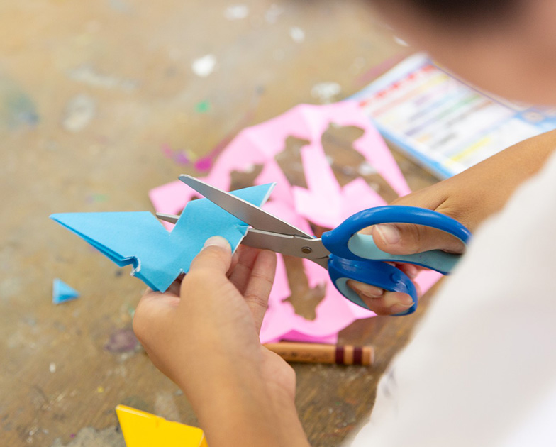 「カッターはやさしく軽く持つといいよ」「しっかり材料を押さえるといいよ」など、左右の手の使い方や力加減、意識が向きづらいほうの手に注目させる声かけも大切です。