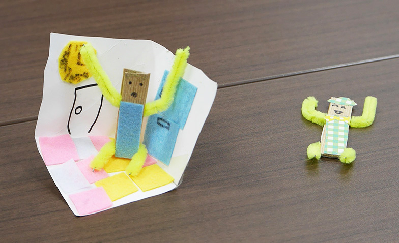 一人は帽子をかぶっておめかししてニコニコしてて、もう一人はなんかびっくりしたような顔をしてますよね。同じにつくってもよさそうなものだけど、ちょっと違う顔にしてるんです。お洋服もそれぞれフェルトと紙を使ってつくってる。きっとつくりながら「この子はこんな性格でこんなことが好きで……」っていろいろ考えてたのかなって。
