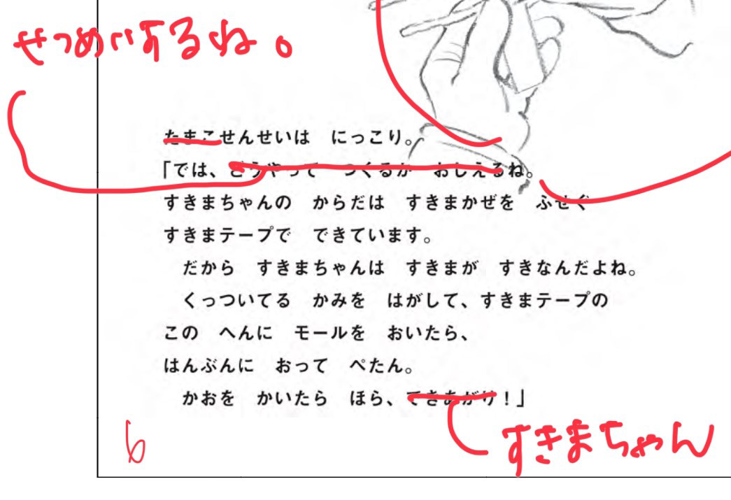例えば、最初は「すきまちゃんのつくりかた」とか「できあがり」っていうふうにしてたんですね。でも雑談しているときに先生が