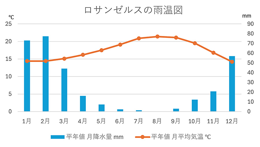 なお、下の図は前掲の表を雨温図にしたものですが、表形式と比較することで、気候の特徴を視覚的に捉えやすいという雨温図やハイサーグラフの意義を実感することができるかもしれません。
