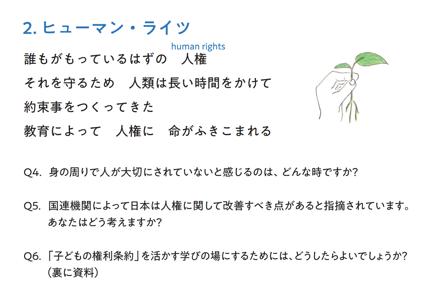 このカード教材の「先輩」として、アムネスティ・インターナショナルによる世界人権宣言を学ぶ教材や、ユニセフによる子どもの権利を学ぶ教材があります。いずれも人権の大切さを伝える優れた媒体であると言えましょう。上記の3つ目の問いにある「子どもの権利条約」については、参考文献3.をご覧ください。また冒頭に掲げた文章は、世界人権宣言を大胆に意訳した詩人、谷川俊太郎によるものです。詳細は参考文献4.をご覧ください。