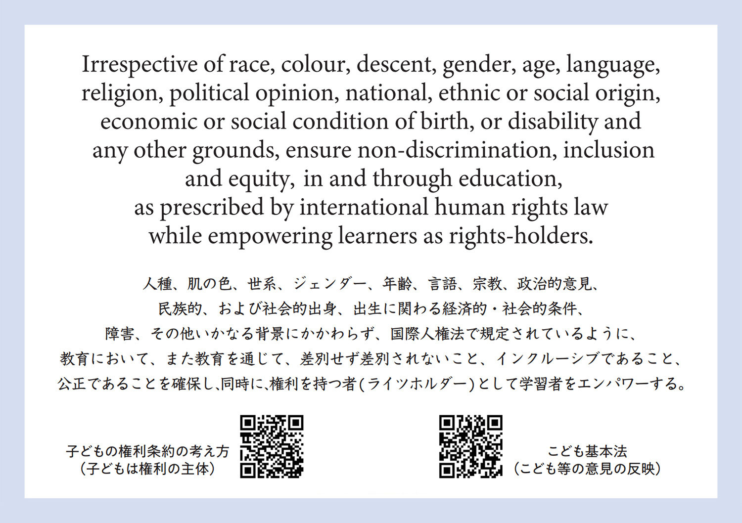 カードの表(おもて)面(図1参照)を見ると、次のように書かれています。「どんな違いがあろうとも だれもが差別されない権利をもっている 学びによって すべての人を 『権利をもつもの』として 力づける」。この中の「違い」は裏面(図2参照)に記載の「人種」から「障がい」に至るまで、人類が差別を正当化してきた「理由」上の違いを指しています。