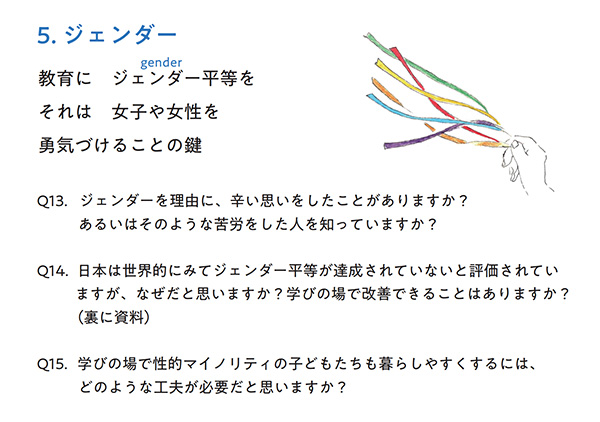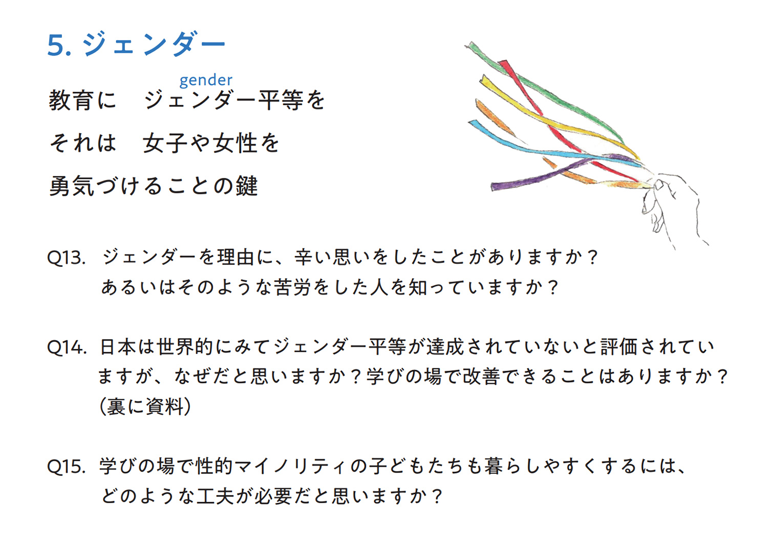 このシリーズも5回目となりました。今回のテーマは「ジェンダー」です。紙上でも使われるようになった「ジェンダー」ですが、一般的には生物学的性差(sex)とは異なる社会的性差(gender)として用いられます。近ごろは、単に性別を指すのに「ジェンダー」を用いることもあるようですが、このカードでは社会・文化的性差を問題にしています。
