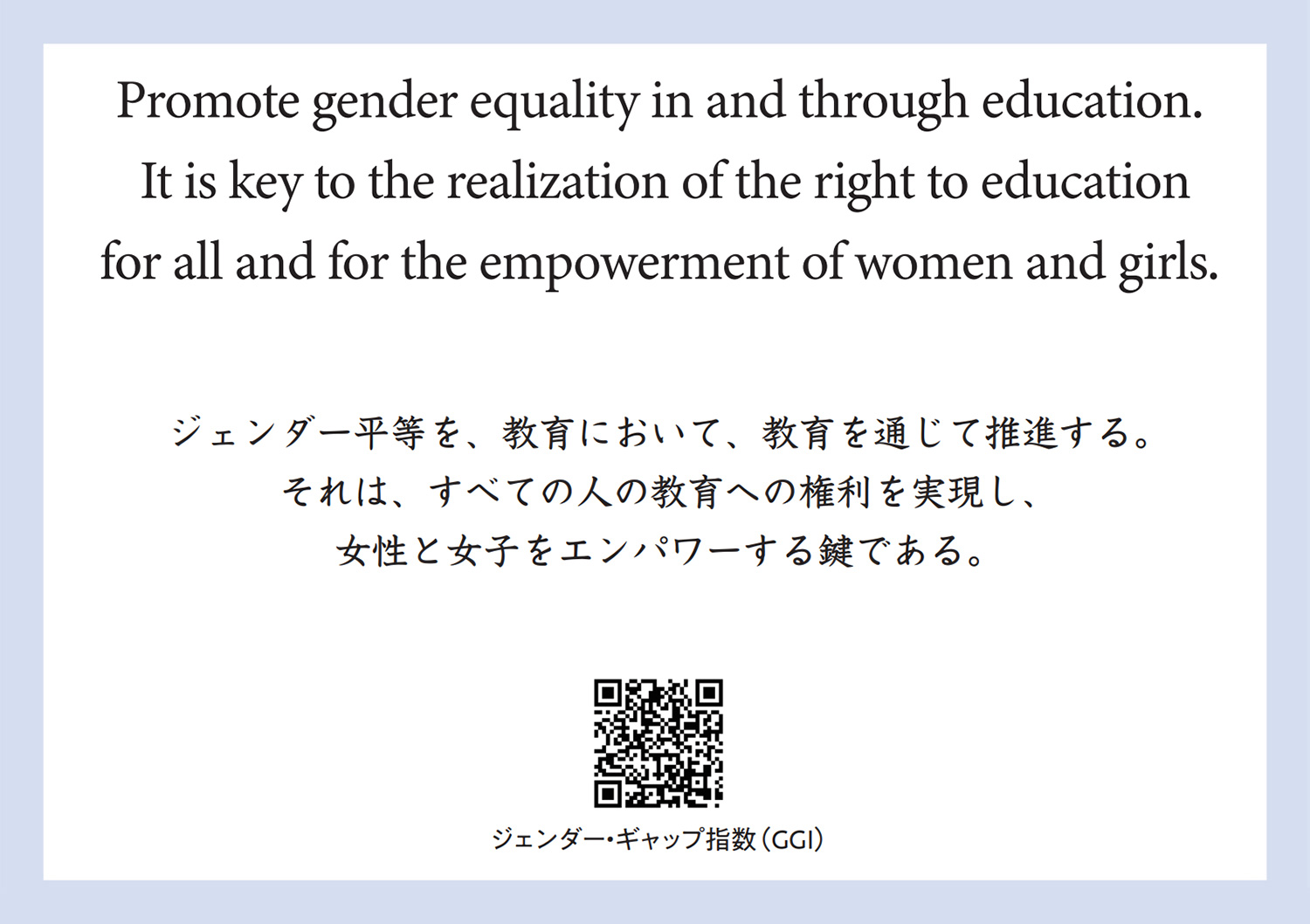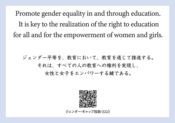 カード表面のエッセンスの文章として「教育にジェンダー平等を それは女子・女性を 勇気づけることの鍵」と書かれています。これは、私たちの社会には男女の差異によって差別がまかり通っていて、特に女子・女性がその被害を被っており、その解決にはなによりもまして教育が重要であるというメッセージの「超訳」です。「勇気づける」は裏面にある原文の「エンパワー」を訳した表現です。