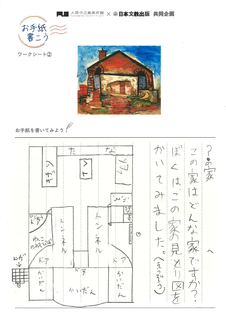 手紙を書くとは、一方的な活動ではありません。相手とつながり合う活動です。相手のことを想い、相手のことを考えて書かれるのが手紙です。この絵には、正面しか描かれていません。でも、子供には、もっと多くのことが見えています。この家にはずっと奥があること、左右対称の特徴があること、入り口の先には「トンネル」があって、部屋には棚やキッチンなどがあること、、、この見取り図は、ただの勝手な「空想」ではなく、絵と対話した手がかりをもとに描かれているのです。