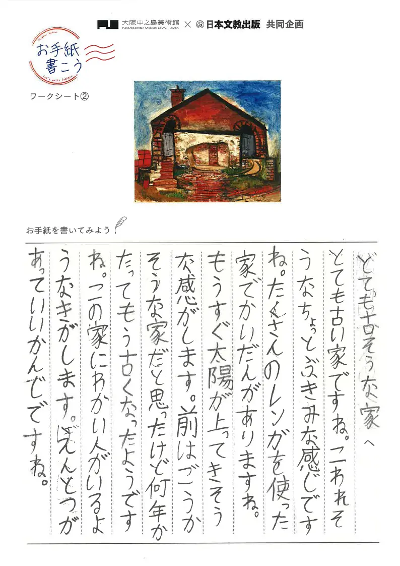 この家には「えんとつ」があります。家は「たくさんのレンガ」を使っていて、「かいだん」もあります。全体よりも部分をみつめたから分かることです。この家がつくられてから「何年」もたって「古くなった」と思ったのは、筆のあとや色の変化からでしょう。「もうすぐ太陽があがってきそう」なのは、家の背景の色から考えたことでしょう。この子は絵から『年月』や『時間』も感じているのです。そして、たどりついたのは、この家には「若い人」が住んでいることです。たくさん絵とおしゃべりして書かれた手紙です。