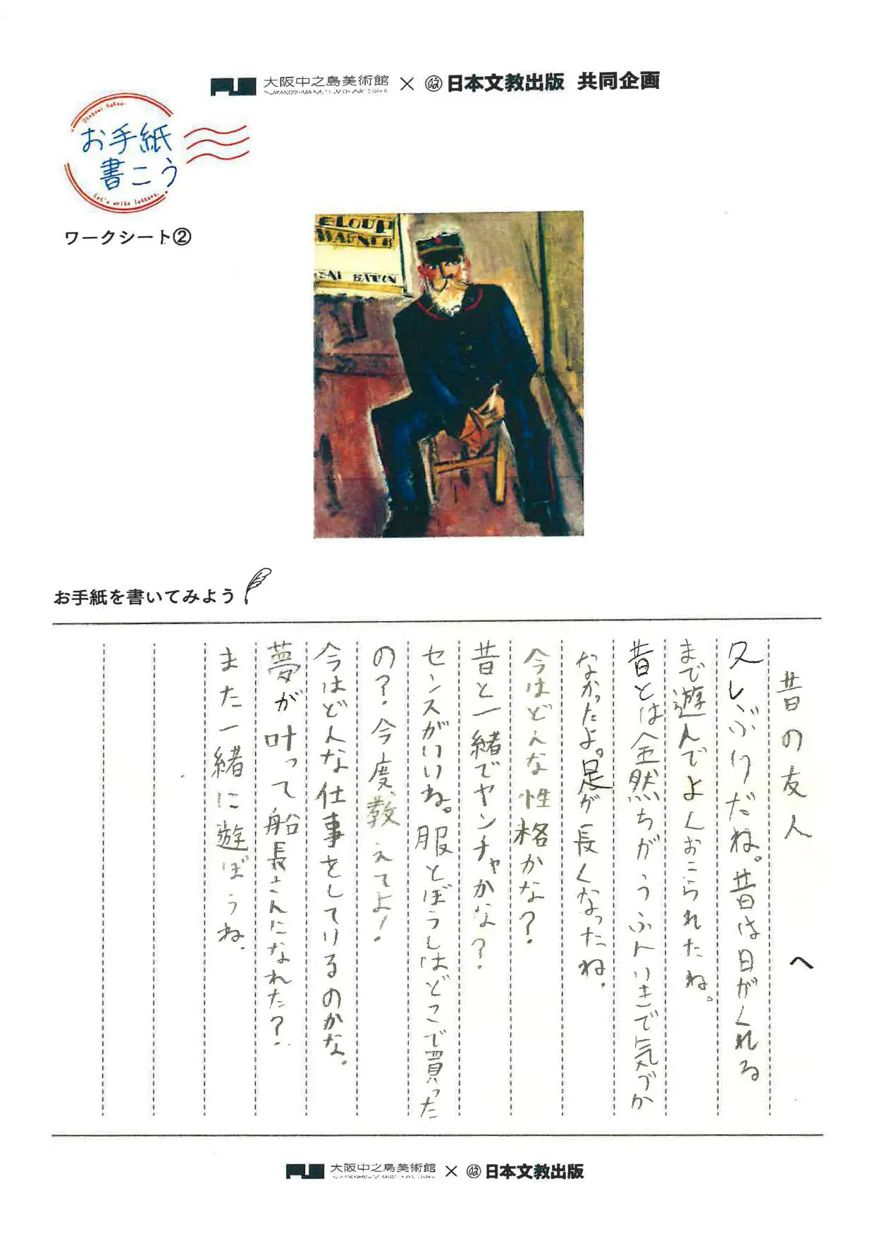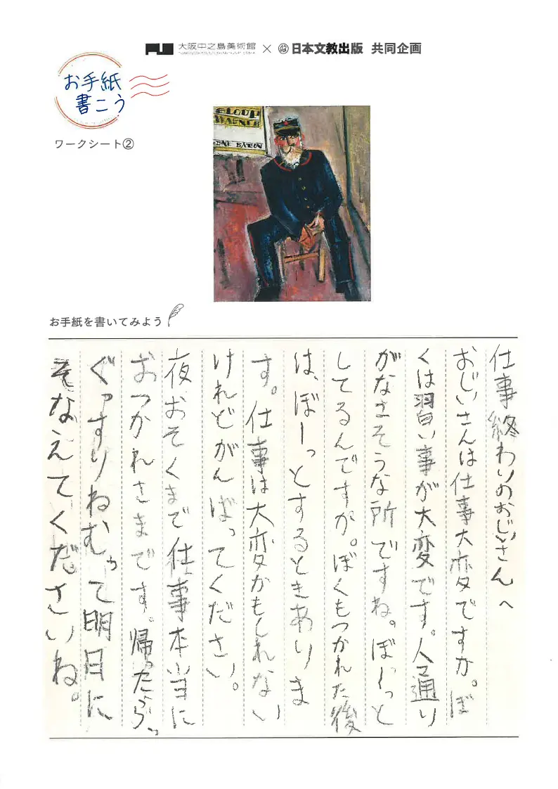 描かれた人物が「仕事終わり」だととらえたのは、「人通りがなさそう」な所に座っているからでしょうか、それとも、人物の表情や少し傾いた姿勢から忙しい何かを終えたときの「ぼーっとしてる」状態だと思ったのでしょうか。この「仕事終わり」と「ぼーっとしている」という2つの点で、絵の人物と子どもは重なります。この子も習い事が大変で、疲れるようですね。絵の人物にかけた「おつかれさま」「ぐっすりねむって明日にそなえてください」という励ましは、自分自身に向けた言葉でもあるでしょう。