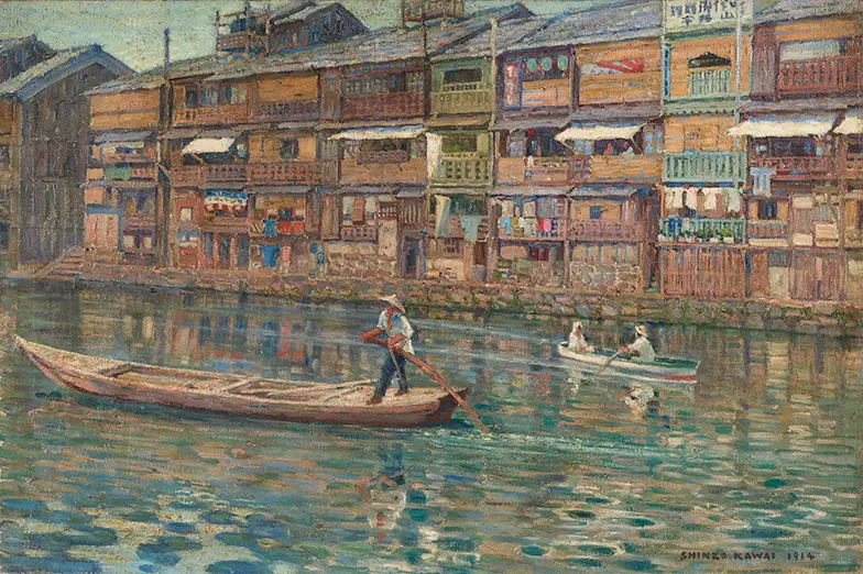 ちょうど110年前の道頓堀川を描いた作品。川端に立ち並ぶ特徴的な建物を背景に、2艘の船が川を行き交います。建物や人物が映り込んだ水面に、船が通った跡が筋を描き、揺らめきで生じたさざなみが点描風に描き出されています。建物を見てみると、ひさしや張り出し窓、洗濯物などが細かく描写されており、生活者の存在が感じられます。明治・大正期に活躍した河合新蔵は、水彩画の名手とうたわれ、克明な写実描写を得意としました。