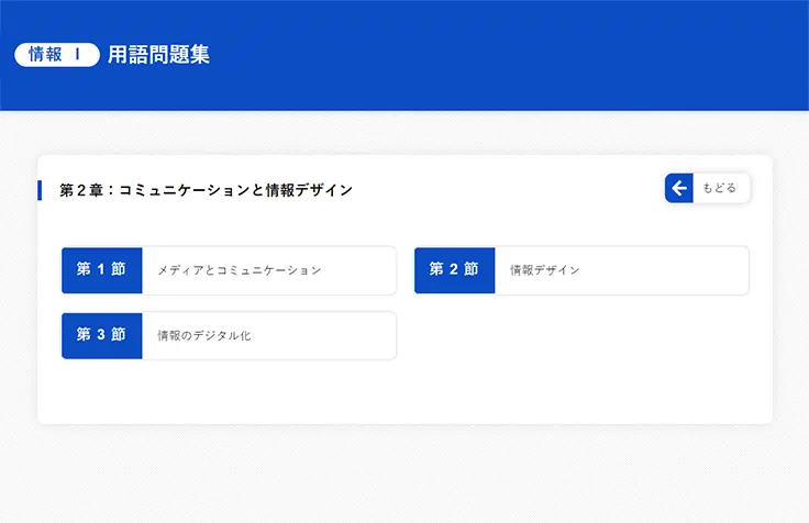 「情報」にはたくさんの用語が登場します。教科書に登場する基本的な用語の意味を把握しておくことは、将来にわたって情報関係の視野を広げることに役立ちます。問題数は全260問。各章ごとの出題のほか、ランダムで出題する機能も用意しました。